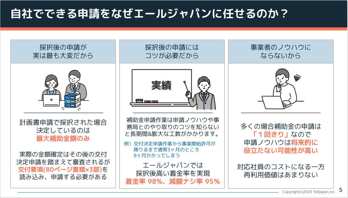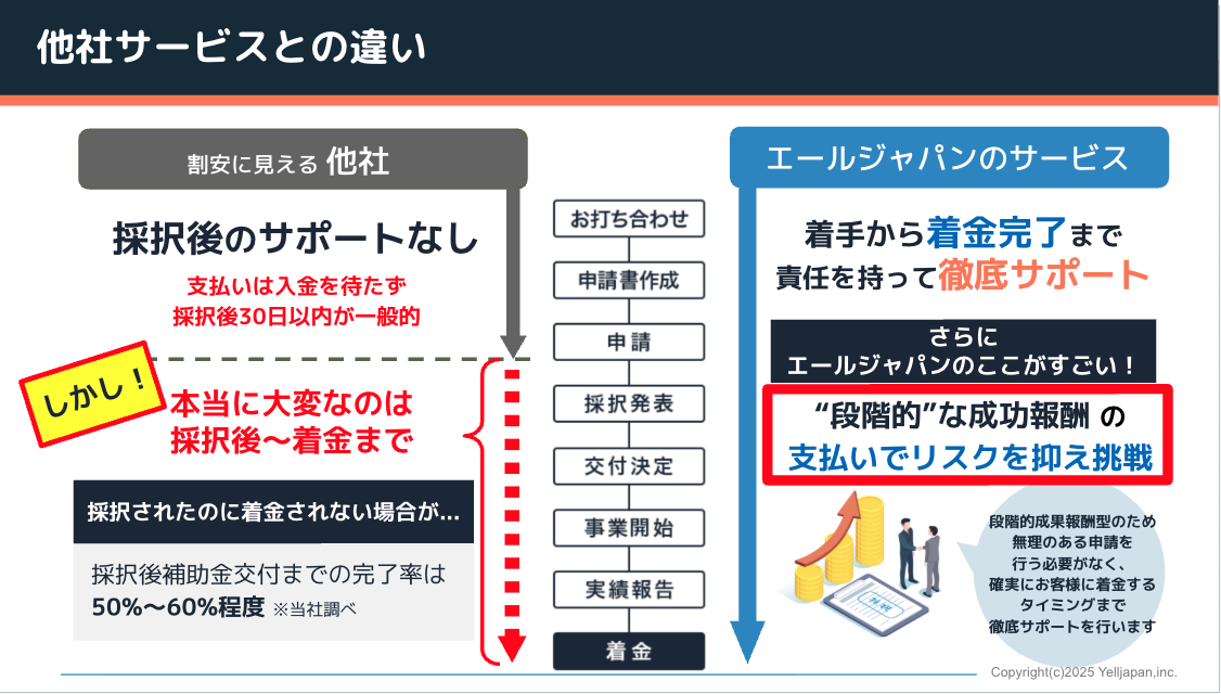 「補助金を通す」だけでなく、「確実にお金を受け取る(着金)」ことにコミットし、かつ「顧客のリスク(手間・金銭)」を最小限に抑える仕組みが構築されている点が、このサービスの最大の特徴です。